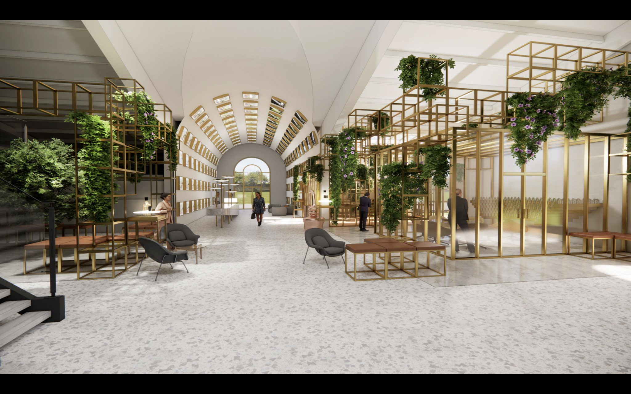 Un concept architectural qui reprend les codes de la marque, les caissons, dans leurs 2 interprétations : sous les arches, en rappel des écuries de Versailles et en superstructure pour délimiter les espaces de Hall, de travail, de réunion et de découverte des essences de plantes qui font la renommée de la marque